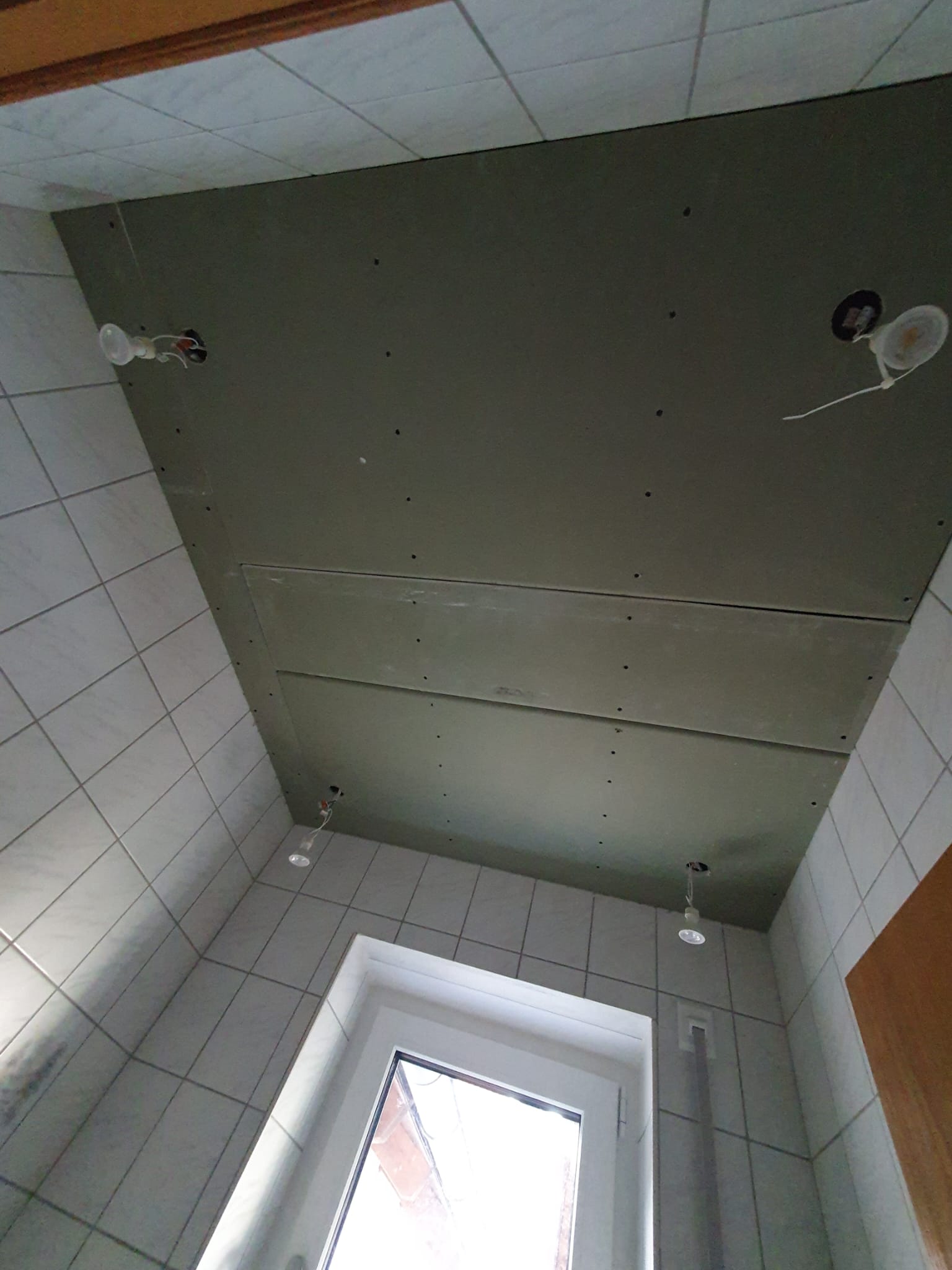 - Die Gipskartonplatten werden mit Trockenbauschrauben an der Decke befestigt. Die Schrauben müssen versenkt werden, damit sie später vollständig mit Spachtelmasse bedeckt werden können.